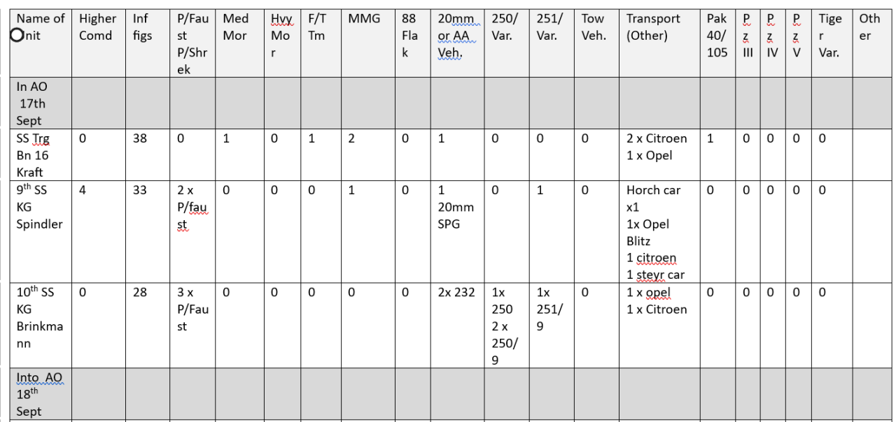 I have started with the old Market Garden campaign book, and created my own document which allows me to hit my collecting, modelling and painting goals and know what is outstanding and therefore to concentrate my efforts in bringing them to the tabletop.I have attached examples of my spreadsheet work below so you can see what I'm talking about.
